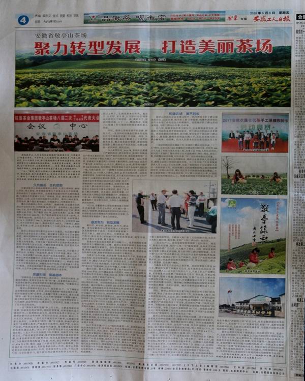 近日(ri)(ri),安徽工人日(ri)(ri)報記(ji)者(zhe)走進敬亭山茶場(chang)風(feng)采(cai),專訪(fang)了(le)五一勞(lao)動獎章獲得(de)者(zhe)謝(xie)臘梅,并專版報道了(le)敬亭山茶場(chang)聚力(li)轉(zhuan)型發展(zhan)、打造美麗茶場(chang)的最新成(cheng)果。
