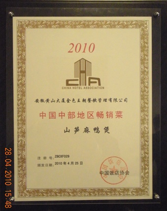 作為壓軸大戲的中國餐飲企業家峰會——武漢峰會暨美食博覽會頒獎大會,高朋滿座,會聚了我國餐飲行業的知名企業家、餐飲業管理專家等300余人。會上,黃山大廈金色王朝餐飲管理公司總經理鄭群榮獲“推動中部餐飲業發展成就獎”,同時,該公司推出的徽菜佳肴“山筍麻鴨煲”被中國飯店協會評為“中國中部地區暢銷菜”。