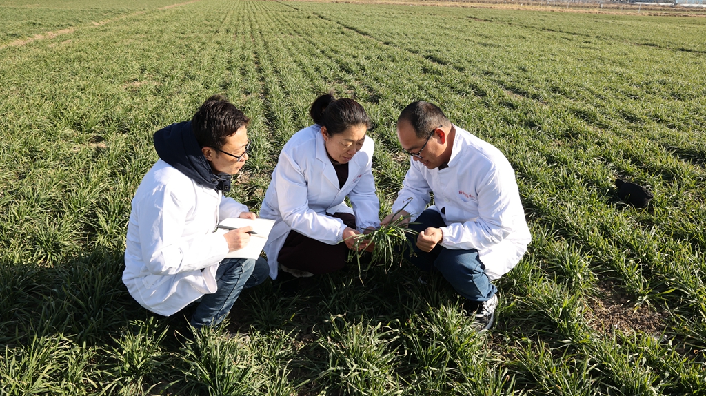 元月上旬(xun),龍亢農場(chang)農業科技(ji)(ji)創(chuang)新中心(xin)科技(ji)(ji)人員深入田間,開展極(ji)寒天氣條件的小(xiao)麥(mai)苗情(qing)調研(yan),記載小(xiao)麥(mai)生長數(shu)據。(李 峰 攝)