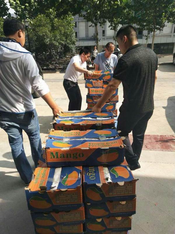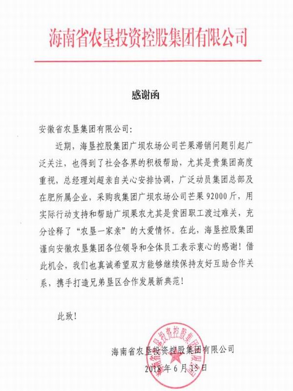 今年海南農墾水果大豐收,但近期銷售難、賣價低、果農愁,尤其是廣壩農場公司芒果滯銷嚴重。海墾集團發來求助信息,安徽農墾集團高度重視,總經理劉超親自安排協調,由皖墾農產品超市牽頭助銷,制定工作方案,廣泛動員集團總部及在肥所屬企業,聯系“五星”等水果經銷商,僅一周時間就銷售“愛心芒果”9.2萬斤,傾情支持和幫助廣壩果農尤其是貧困職工渡過難關,充分詮釋了“農墾一家親”的大愛情懷。