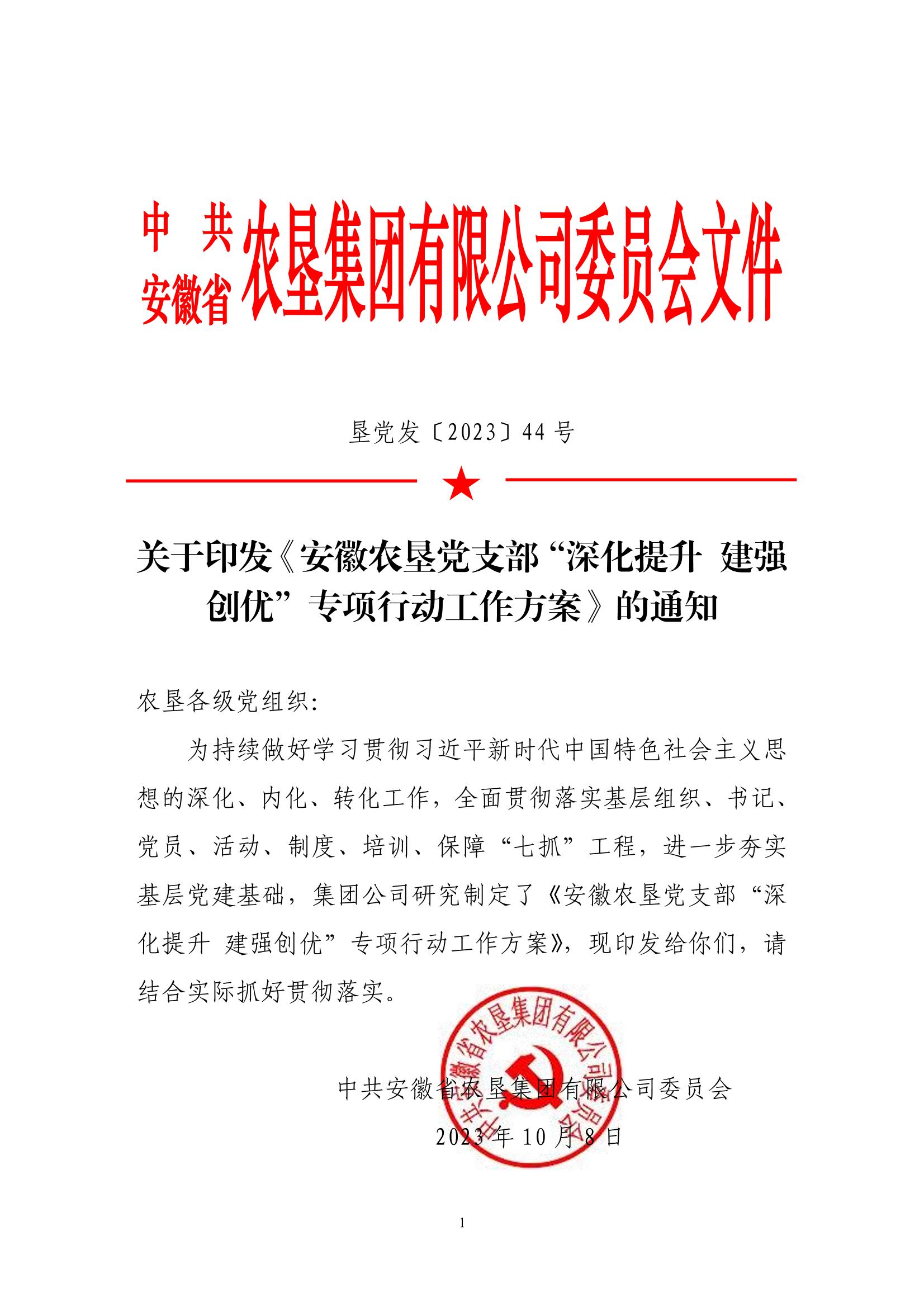 為持續做好學習(xi)(xi)(xi)貫(guan)徹(che)習(xi)(xi)(xi)近(jin)平(ping)(ping)新(xin)時(shi)代(dai)(dai)中國特(te)色社會主義(yi)思(si)想(xiang)的深(shen)化(hua)、內化(hua)、轉化(hua)工作,鞏固(gu)學習(xi)(xi)(xi)貫(guan)徹(che)習(xi)(xi)(xi)近(jin)平(ping)(ping)新(xin)時(shi)代(dai)(dai)中國特(te)色社會主義(yi)思(si)想(xiang)主題教育(yu)成果,夯實(shi)基(ji)層黨建基(ji)礎,提升(sheng)黨建水(shui)平(ping)(ping),創新(xin)農(nong)墾(ken)(ken)黨建工作模式(shi),逐步打造農(nong)墾(ken)(ken)1+N黨(dang)建品牌(pai)體系,近(jin)日,安徽(hui)省農(nong)墾集團公司黨(dang)委印(yin)發了《安徽(hui)農(nong)墾黨(dang)支部“深(shen)化提升 建強(qiang)創優”專項行(xing)動工(gong)作方案》。