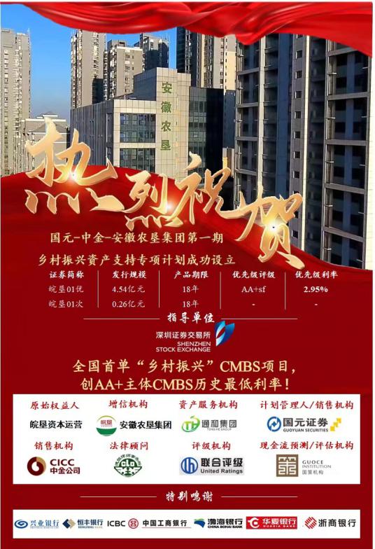 據悉,該項(xiang)目為(wei)全(quan)國首單鄉村振興商業房地產抵押貸款(kuan)支(zhi)持證券(CMBS)項目,債券總發行(xing)規模為4.80億元,其中“皖墾(ken)01優”發(fa)行規模為4.54億元,發行期(qi)限為18年,票面利率為(wei)2.95%;“皖墾01次”發(fa)行規模(mo)為0.26億元,發行期限為18年。債券發行利率創全國AA+主體CMBS 有史以來最低。該(gai)項(xiang)目增信機構(gou)為安徽農墾集團,原始權益人和資產服務機構分別為安徽(hui)農(nong)墾集團(tuan)下屬的皖墾資本運營(ying)公司、通和集團公司,計劃(hua)管理人為(wei)國元證券股份有限公司。