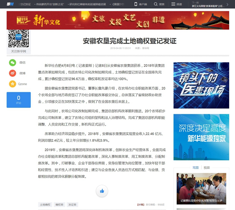 新華網4月8日報道《安徽農墾完成土地確權登記發證》,報道截圖如下: