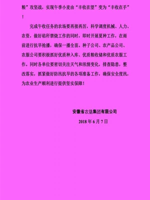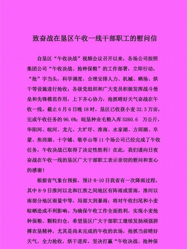 安徽農墾集團致信慰問午收一線干部職工