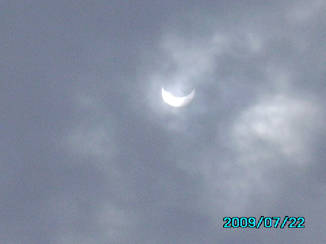 9時39分前后,天空漸漸透亮。團團黑云在天空移動,太陽只露出一線亮光,繼而再次出現月牙形狀。漸漸恢復如初。