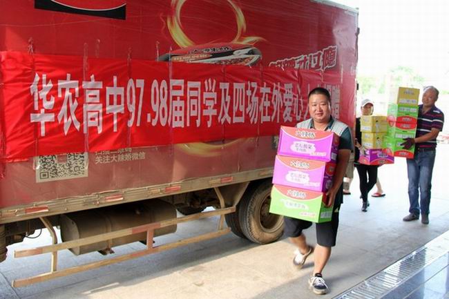 在四分場職工桂志洋發動下,華農高中97、98兩屆同學及四分場愛心人士,建立了名為“聚愛心,保家園”的微信群,在朋友圈相互轉發,讓更多人了解農場最新動態,不到兩天時間就籌集善款1.6萬元,購買200箱礦泉水、300箱方便面和價值3800元的防暑藥品,送到了農場防汛辦。安徽天溢建筑公司項目經理葉端喜得知家園遭受大災后,慷慨捐款4萬元。另有一些愛心人士還捐贈了3條船。
