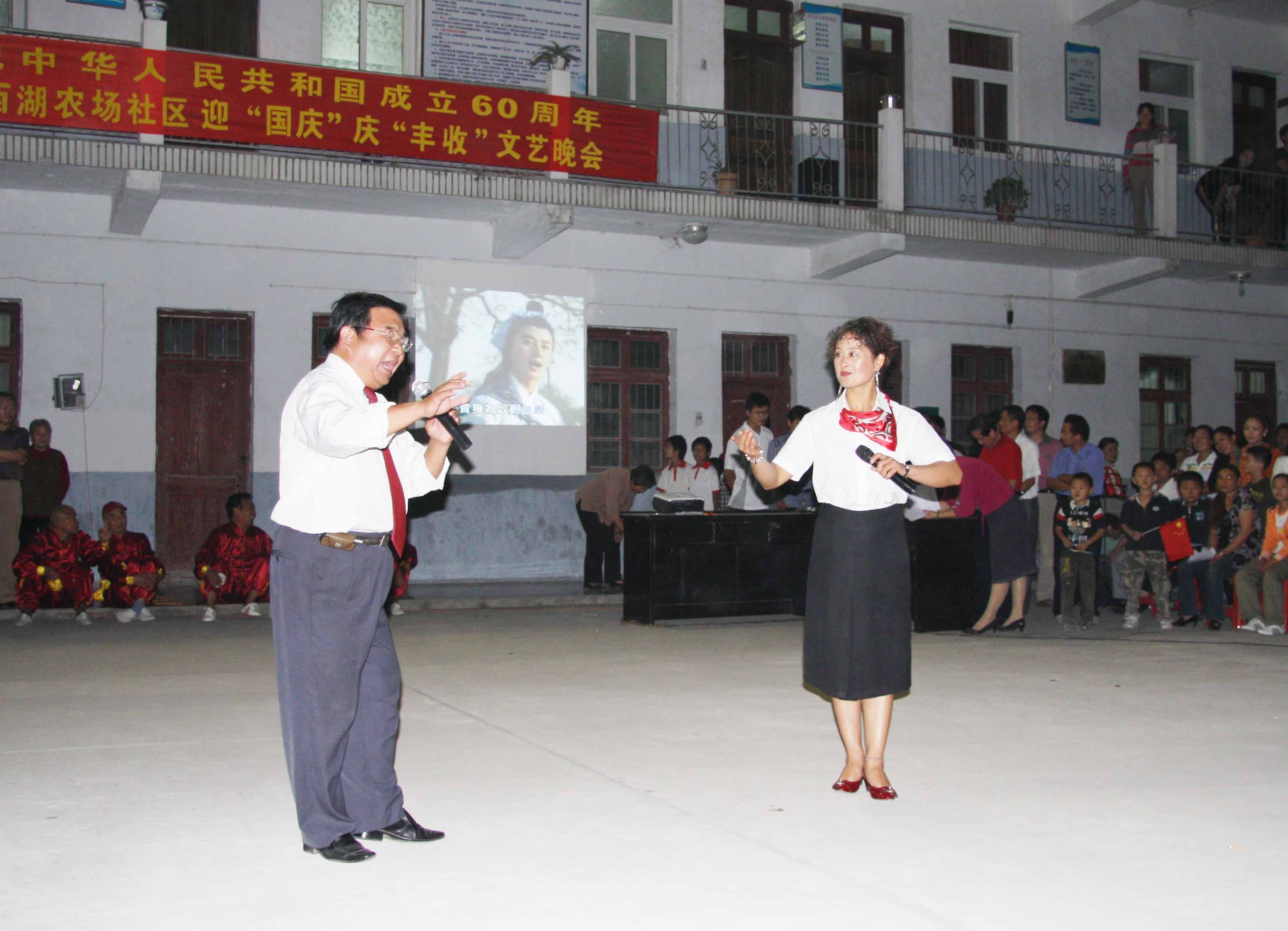 近年來,壽西湖農場在創建文明、和諧社區方面取得了優異成績,社區各項事業蓬勃發展。為慶祝我們黨的60華誕,歌頌我們偉大的祖國,進一步活躍居民文化生活,社區編排了一些富有社區氣息、形式多樣的精彩文藝節目,奉獻給大家。晚會在威風的《壽州鑼鼓》中拉開序幕,接著有聲情并茂的獨唱、振奮人心的合唱、精彩的集體舞蹈、高超的武術表演,還有別具風格的管弦樂演奏和時尚動感的現代健身操等優秀的節目。晚會上演員和居民們載歌載舞、激情澎湃,熱烈慶祝我們偉大的節日,謳歌我們美好的生活!歡歌、笑語和掌聲此起彼伏,整個廣場變成一個歡樂的海洋。最后,晚會在男女合唱《走進新時代》的歌聲中圓滿結束。