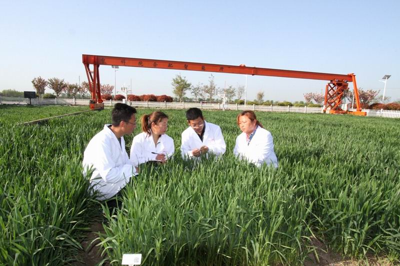 上(shang)圖1.農場副(fu)場長(chang)、高級農藝師王永玖帶領科研人(ren)員在小(xiao)麥(mai)高通(tong)量育(yu)種試(shi)驗(yan)田查看苗情