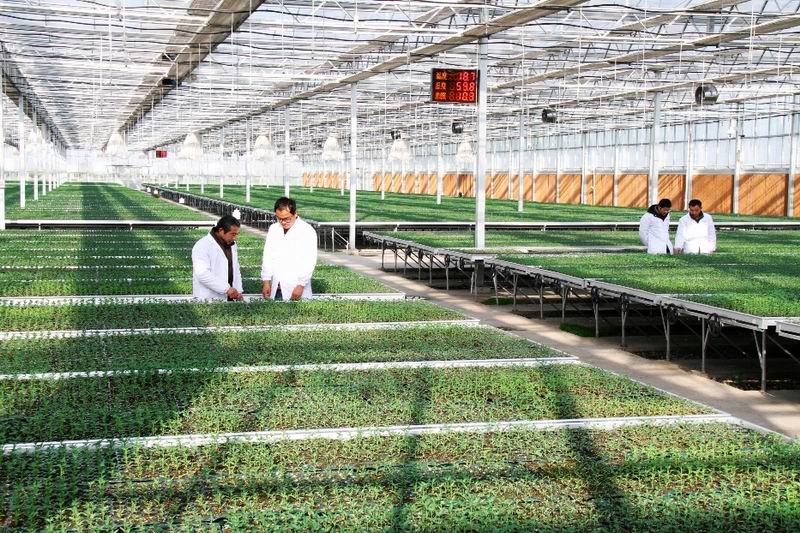 上圖2.農技人員在(zai)智能溫(wen)室(shi)大棚(peng)查(cha)看特種蔬菜苗(miao)長勢