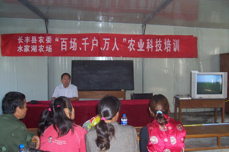 2009年8月31日上午,在長豐縣農委的支持與配合下,水家湖農場安排了專業的技術人員,在長豐縣明潔專業合作社的培訓地點,舉辦了一次農業科技培訓班。此次培訓主要將農場的小麥高產栽培技術、農業機械化作業規程等介紹給農民。參加培訓的人員達80余人,通過聽課,農民不僅增進了對農場的了解,也對農場推廣的的良種良法產生了濃厚興趣。授課結束后一再咨詢農場的良種、農藥銷售點,培訓效果較好。