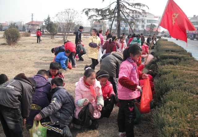 3月4日,龍亢農場小學少先隊員們走出校門,在龍亢農場廣場開展以“倡導文明,美化家園”為主題的義務勞動。草坪上、樹叢下都是同學們的身影,他們半蹲著,用自帶工具埋頭撿紙頭、拾果皮,不一會兒廣場面貌煥然一新。
