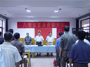 紀念大會在雄壯的《國際歌》聲中開始。10名新入 黨的同志面對鮮紅的黨旗高舉右手莊嚴宣誓,立志 為共產主義事業奮斗終身。新、老黨員代表梁國 海、孟凡東滿懷激情,分別在會上發了言。會議還 對在過去一年中為農場兩個文明建設做出突出貢獻 以及在抗擊“非典”戰斗中表現突出的3個先進黨支 部、6個先進黨小組、18名優秀共產黨員和13名優秀 黨務工作者給予了通報表彰。