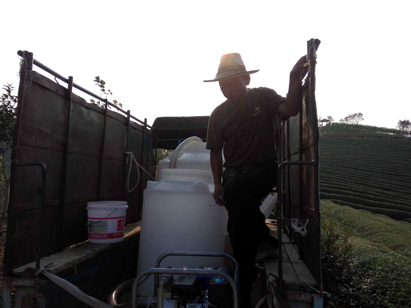 山北分場葫蘆山,馮正云家承租的茶園占了半個山頭,現在不少茶樹有一些曬焦了,但總體看上去仍是綠意蔥蔥、充滿生機,這得益于他定時給茶園澆水。每天下午4、5點鐘,馮正云就帶著家人,開著三輪車裝上滿桶清水,上山給他的茶園澆灌,一人澆水,一人抬水管,一人盯水壓泵。一桶桶清水從山下運到山上,從車上順著水管噴向茶行每一個干涸的角落。太陽下山去,月亮升起來……。一遍水澆下來,有時要干到夜里10點多。馮家一家人始終沒有停歇,這樣堅持快10天了。