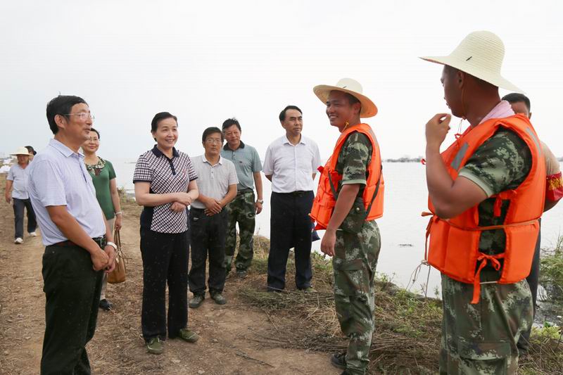 李素萍又前往一分場迎湖大堤,看望了堅守在防汛一線的農場干部職工和武警部隊官兵。(程來寶)