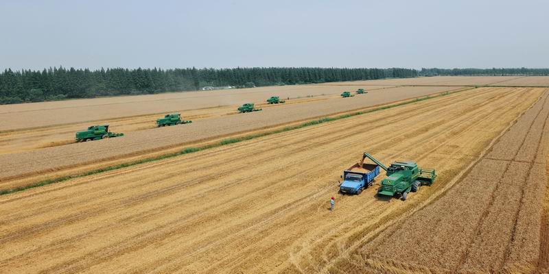 面對今年極端天氣形勢的影響,為確保糧食顆粒歸倉,安徽農墾把“搶收保種”作為攻堅任務,投入大型聯合收割機械、拖拉機等農機具5000臺套奮力搶收,實現了小麥全程機械化。圖為壽西湖農場農機會戰現場。(人民日報