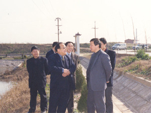 農墾系統2000-2002年農業綜合開發工作在省財政關 心支持下,取得了顯著成績,其中華陽河土地治理 項目被評為全省優良工程。圖為3月9日,省財政廳 (前左)項仁安副廳長在集團公司田文俊總經理 (前右)陪同下,親臨華陽河農場農業綜合開發項 目區檢查指導工作。