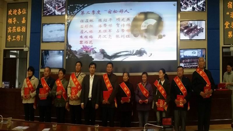 頒獎式上,榮獲第二季度見義勇為“宿松好人”的農場退伍老兵任在林(圖片右一)上臺領獎,他“勇救落水兒童”的英雄事跡在宿松縣廣為流傳。(程來保)