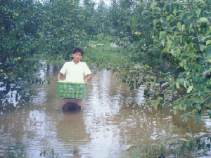 8月29——30日,碭山果園場突遭特大暴雨襲擊,受 災 情況嚴重。圖為職工在深水中采收酥梨、包 裝果 品。(碭山果園場辦公室)