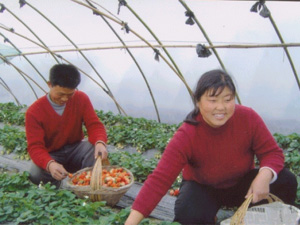 安徽省水家湖農場鼓勵職工調整產業結構,大力發 展大棚草莓生產,目前已有十幾位草莓種植戶,為 水家湖農場經濟增長、職工增收起到了重要作用。 圖為大棚草莓種植戶采摘草莓時喜悅的心情。