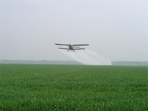 連日來,龍亢農場投入50多萬元,用于3萬畝小麥的 飛機防治作業,比人工作業每畝降低生產成本4-5元, 畝均增加產量80-100斤,預計整個兩次的作業將持續 到4月底結束.圖為飛防作業現場.+