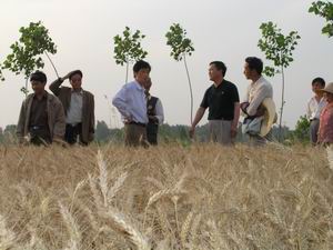 針對近日天氣狀況可能對麥收帶來不利影響的形 勢,潘村湖農場午收夏種指揮部于6月3日下午召開 緊急會議,要求各農業分場立足“早”字,突出 “搶”字,克服“靠干”思想,成熟一塊收獲一 塊,力爭把到手的糧食搶收上來。到3日晚上9點, 該場六分場已完成收獲任務的70%%。圖為韓大鳴場 長、殷文格副場長在田間指揮午收生產。(楊登宏)