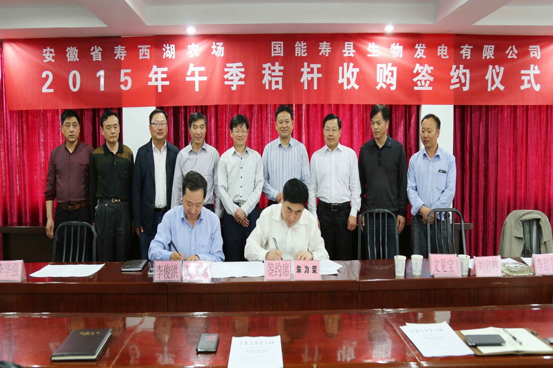 為貫徹落實省政府關于加快發展農作物秸稈發電的意見,4月27日下午,安徽農墾壽西湖農場與國能電力集團旗下壽縣生物發電有限公司舉行2015年秸稈收購簽約式,聯手推進5.6萬畝農作物秸稈禁燒,添力秸稈能源化利用和資源節約、環境保護。