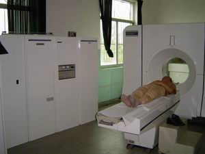 龍亢農場醫院千方百計籌措資金更新醫療設備,提高 醫療技術水平,擴大醫療半徑,取得了良好的經濟效 益和社會效益。圖為醫院醫生在為病員做CT檢查。
