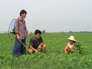 圖片說明:潘村湖農場廣大職工家庭農場抓住當前 有利時機積極開展大豆田間管理工作,力爭奪取秋 季豐產豐收。圖為分場農技人員在田間指導職工做 好化除工作。(楊登宏攝)
