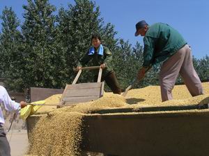 連日來,潘村湖農場抓住當前晴好天氣,組織人力 和機械全面打響秋收戰役,到9月27日,已收獲大 豆2.6萬畝,完成任務的81%。由于管理措施到位 加之天公作美,今年該場3.2萬畝夏大豆喜獲豐 收,從已收獲的情況看,畝產達到200公斤的地 塊占到1/3,預計全場平均單產在190公斤左 右,創建場50年來最高紀錄。圖為家庭農場職工 新收獲的大豆登場的情景。(楊登宏)