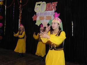 為慶祝建場50周年,潘村湖農場于12月9日舉辦了大 型職工文藝匯演活動。來自場屬各單位的100余名文 藝愛好者為全場職工群眾奉獻了25個精彩的歌舞節 目。圖為由種子公司選送的舞蹈《新疆好》。(楊 登宏攝)