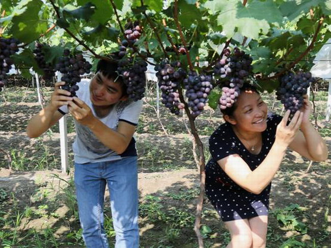 連日來,安徽淮南農場高效農業觀光園內,一串串黑珍珠似的葡萄掛滿枝頭、香氣醉人,葡萄架下歡聲笑語此起彼伏。種植戶張香蘭正忙著幫前來采摘的客人裝箱,見到筆者,她滿面笑顏地說:“我家去年種下葡萄苗,今年就掛果了,每畝不下2000斤,每天都有來采摘的游客和水果批發商,目前平均每斤賣到10元,這深紫色的夏黑品種最好銷!”據測算,今年淮南農場葡萄畝均效益超萬元,真正實現了農業增效、職工增收的目標。
