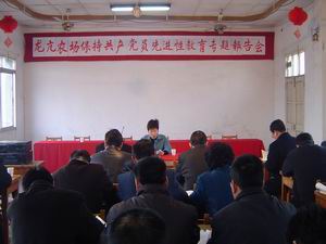 3月19日上午,龍亢農場黨委舉行第四場保持共產黨 員先進性專題報告會,副場長劉梅作題為《保持共產 黨員先進性,努力在實踐中做好本職工作》的專題 報告,100名黨員、干部參加會議。