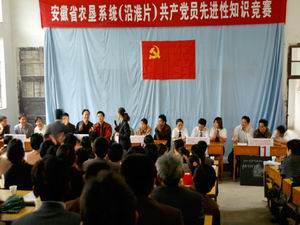 為更進一步把保持共產黨員先進性教育活動推向深 入,5月15日水家湖、馬廠湖、農墾中專、益益乳 業、淮南農場等沿淮五家農墾單位在農墾中專,舉辦 了一場別開生面的黨章、黨史知識競賽活動,競賽中 穿插著文藝節目表演,內容生動,形式活潑,經過 淮激烈的角逐,淮南農場代表隊獲得了第一名,照 片為競賽現場。(蔡小寶)