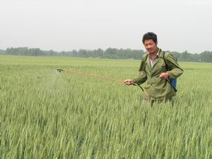 針對今年部分地塊小麥吸漿蟲蟲害較為嚴重的情況, 潘村湖農場積極采取應對措施,發動全場各職工家庭 農場全力以赴展開防治工作.圖為5月10日上午,六分 場青年職工蔣忠正在自家承包田里按照場農技部門 的技術指導,再次進行藥劑噴施作業的情景.(楊登宏 攝)