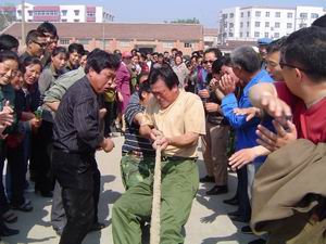 圖片說明:為慶祝“五一”、“五四”節日的到 來,連日來,龍亢農場工會組織開展拔河、自行車 慢騎、羽毛球、卡拉OK、演講等,全場近千名職工 群眾參與活動,豐富了職工業余文化生活。圖為男 子拔河比賽。(王戴群)