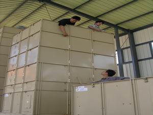 由農業部批復,總投資達700萬元(其中中央財政 580萬元,企業配套120萬元)的國家級優質專用小 麥繁育基地項目去年底落戶潘村湖農場。該項目建 成后,農場可新增制種能力920萬公斤,從而進一步 鞏固其在全省常規種子生產和加工企業行列排頭兵 的地位。圖為工程技術人員正在安裝新型遠紅外種 子烘干線的情景。(楊登宏攝)