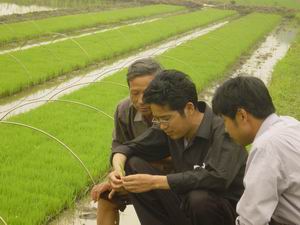 效控制。圖為場植保人員與一分場農技員在機插秧