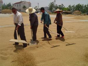 近日,龍亢農場職工抓住晴好天氣涼曬小麥良種,確 保小麥良種的質量。圖為二分場職工涼曬場面。 (龍亢農場 邵乃昌)
